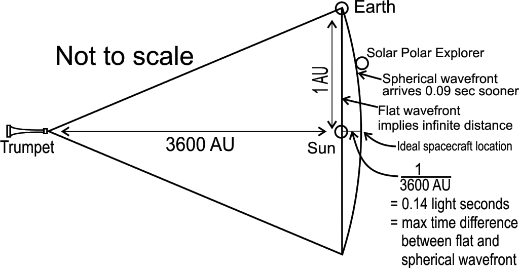 The arrival time on Earth told Frank when the exhaust should arrive at the Solar Polar Explorer, assuming the exhaust wavefront was flat. But the exhaust actually arrived sooner, which meant its wavefront was curved. By working through the geometry he figured out the radius of curvature, which was the distance to the Finger.